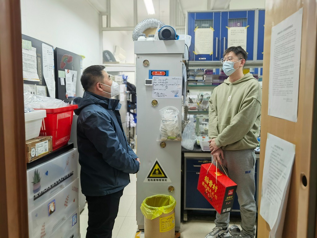 苏靖代表学院向每位留校学生送上新春大礼包,致以节日的祝福。他详细询问留校同学们的学习实验与生活保障情况,叮嘱留校学生做好健康状况监测、适量运动、保障睡眠、劳逸结合,加强与家人的联系。他表示,学院将持续关心关注留校学生的学习生活,希望同学们遇到任何问题随时向导师、辅导员反映。